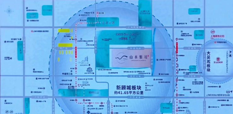 周边生态 : 顾村公园(上海最大郊野公园,2.2公里) , 800亩绿地+湖泊+花海+骑行道,周末可骑行、露营、观鸟 ;