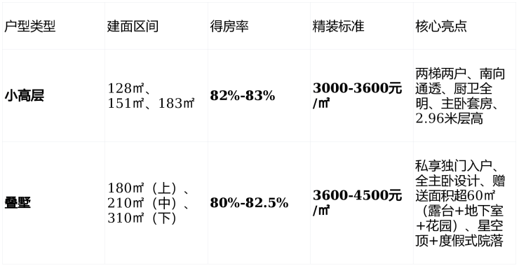 精装标准:标配中央空调+新风系统+地暖+全屋软水+智能门锁+品牌厨电,部分叠墅配备恒温泳池、家庭影院预埋