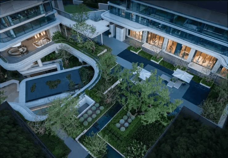 园林设计借鉴“九溪烟树”地貌,通过高差与廊架构建立体溪谷景观,实现“移步换景”的东方意境 。