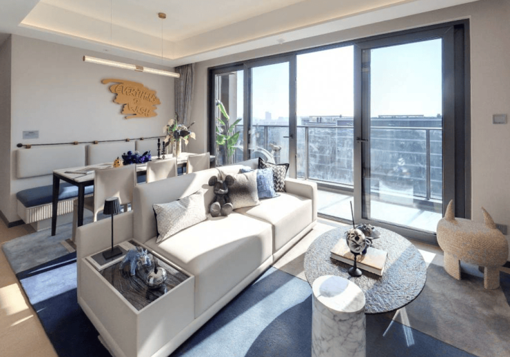 项目精装交付标准约2000元/㎡,全屋配备中央空调、新风系统和地暖三大件。公区配套采用"一环两轴十境"立体园林设计,含400米森氧跑道及十大主题花园。