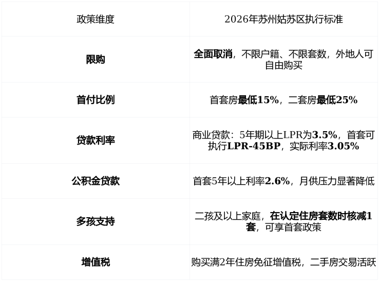 政策红利 :苏州2026年全面取消限购,首套房首付低至 15% ,5年期以上商贷利率 3.5% ,多孩家庭可核减一套住房认定。