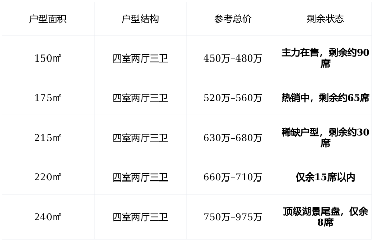 📌 剩余房源不足210套150–175㎡主力户型仍可选,215㎡以上大宅已进入清盘冲刺期议价空间极小,认购节奏加快