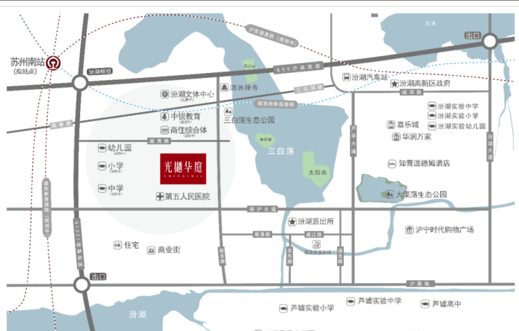 距项目约1千米的汾湖文体中心,定位于汾湖三白荡起点的标志性建筑,分为体育中心和文化中心两大功能区;三白荡原生态湖荡公园,具有两千多年历史的原生态文化底蕴,集娱乐、休闲、体育及城市景观为一体,天然水产丰富,更是未来政府建设生态新城的中心位置