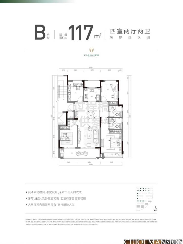 所有户型均为4室2厅2卫设计,明卫明厨,主卧朝南