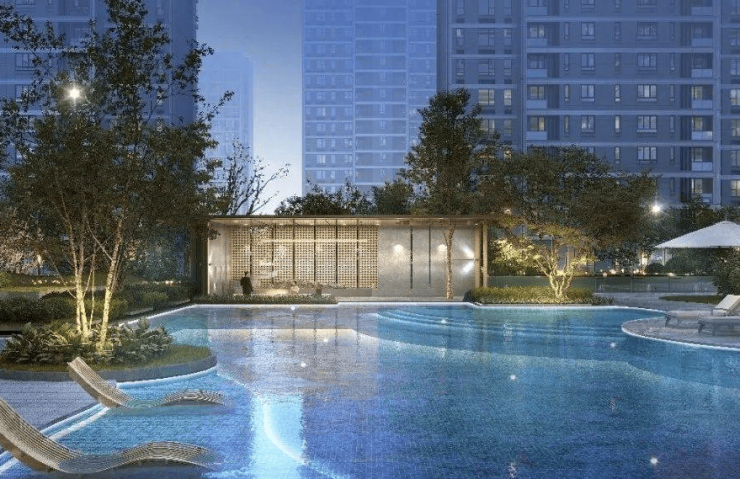 【凤栖星澜】采用围合式布局,以自然·艺术·健康为主题,打造三大核心景观!景观轴线上还配备约480㎡的星光泳池,泳池旁有休闲躺椅区,方便业主会客休息。