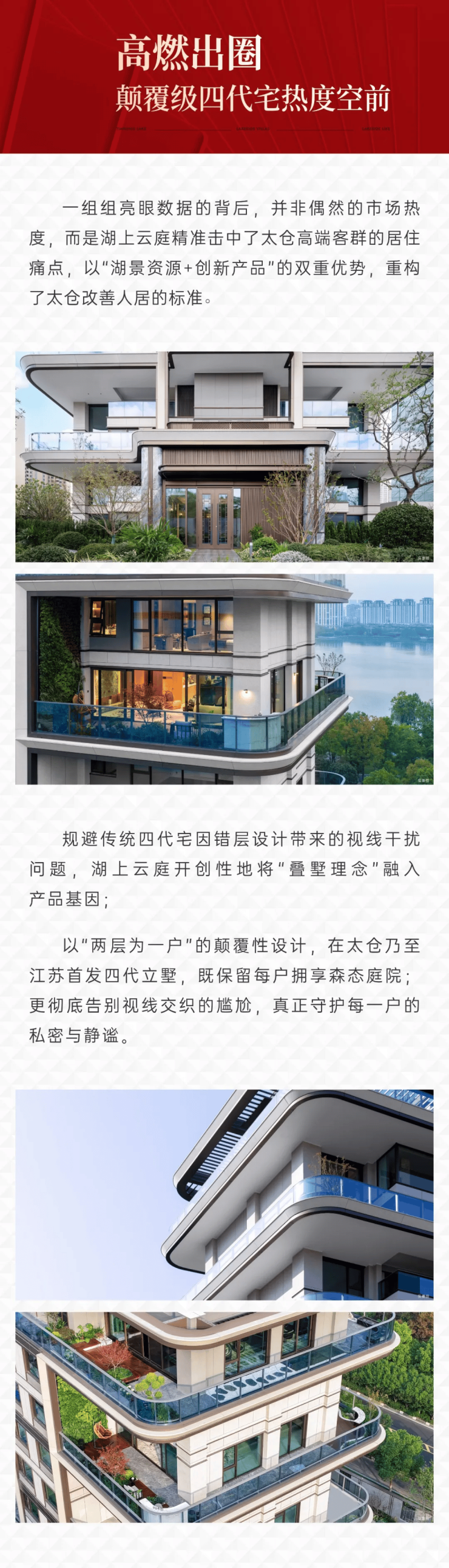 湖上云庭是太仓首个采用“空中庭院+垂直绿化+共享空间”三位一体设计理念的住宅项目,实现“户户有露台,家家有庭院”的森林氧吧生活愿景 。外立面采用180°–360°环幕式露台设计,突破传统奇偶错层布局,部分露台面积最高赠送40㎡,使用率可达91%以上,甚至有宣传称使用率突破100% 。