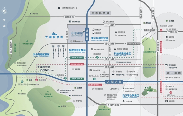 快速路网覆盖:紧邻太湖大道、中环西线,自驾15min直达科技城核心区,30min覆盖狮山、古城、园区,通勤效率显著提升