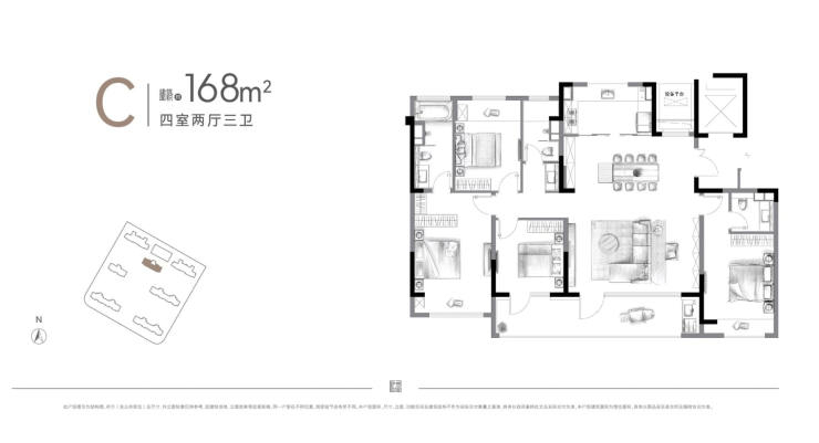 168㎡ 24,400元/㎡起 410万元起 390万元起 四房两厅三卫,主卧带衣帽间+观景阳台,稀缺大平层