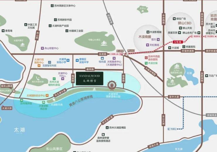 太湖檀宫地理位置优越,交通便利。距离地铁5号线太湖香山站约1.5公里,通达苏州全市,转11号线可连通上海大都市圈。周边还有多条公交线路,自驾出行也较为便利,可快速到达苏州各个区域。同时,项目距离苏州市中心、无锡苏南硕放机场、上海虹桥等地也较为便捷。