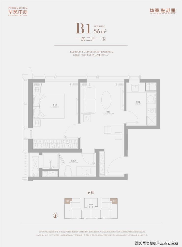 56㎡1 居(B1、B2 户型):1 室 2 厅 1 卫,北朝向,总价 145-155 万 / 套