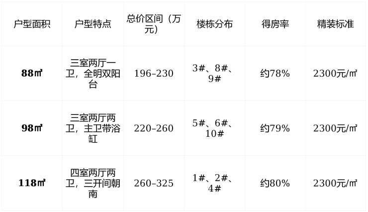 ✅ 温馨提示 :88㎡户型为市场主力,热销快;118㎡四房适合多代同堂,湖景资源稀缺,建议优先锁定高楼层南向单位。