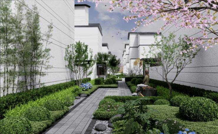 园林设计:江南风格景观,中央种植香樟、银杏,搭配青石板步道