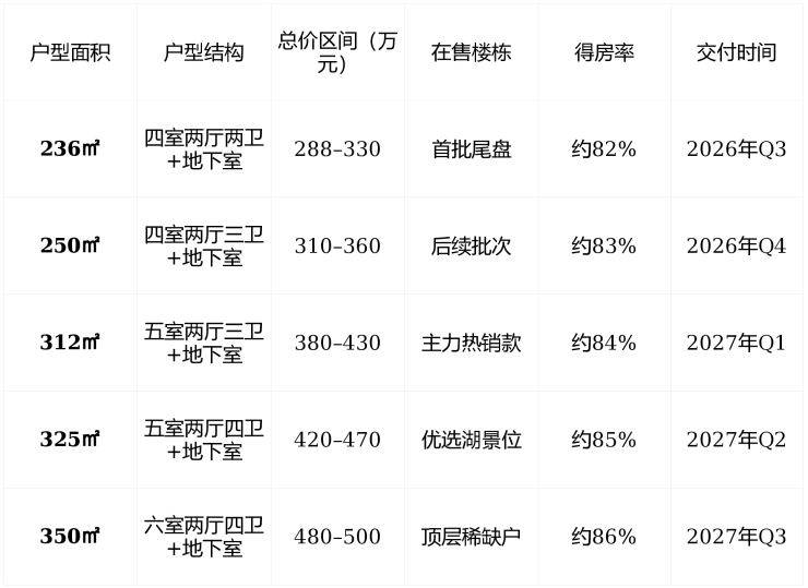 温馨提示236–312㎡户型 仍有余量, 325㎡以上 户型稀缺,建议优先锁定 南向庭院+地下层采光好 的房源。