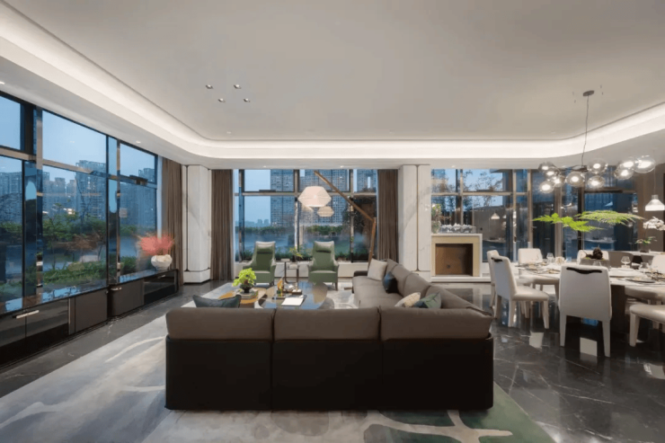 所有户型均为边套设计,配备270°环幕落地窗,三面采光总长近54米,如同IMAX巨幕直面钱塘江景 。高层户型可俯瞰江河双景,部分顶层房源更配有60㎡空中花园或星空露台,私密性与景观性兼具 。