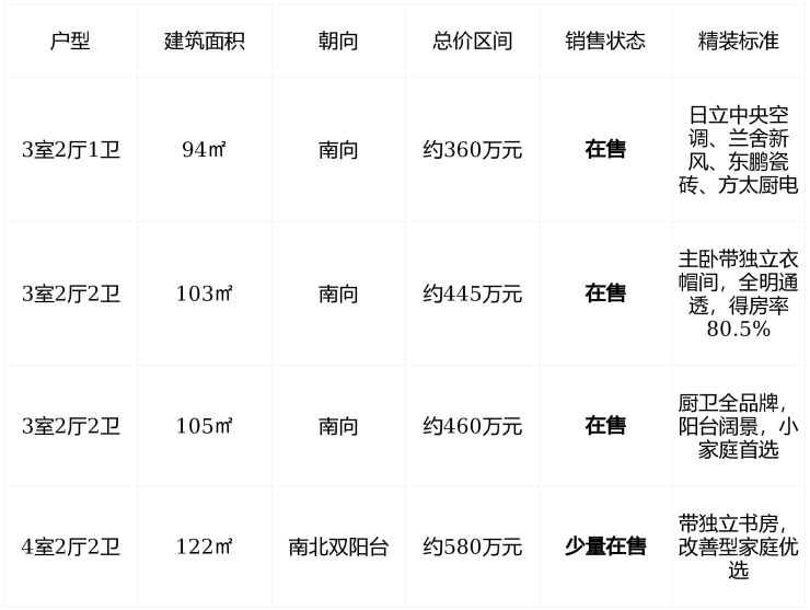 在售户型 :主力在售为 94–122㎡ 三至四房 ,总价 360–580万元 ,均价约 43,600元/㎡ ,目前为清盘阶段,房源紧张。