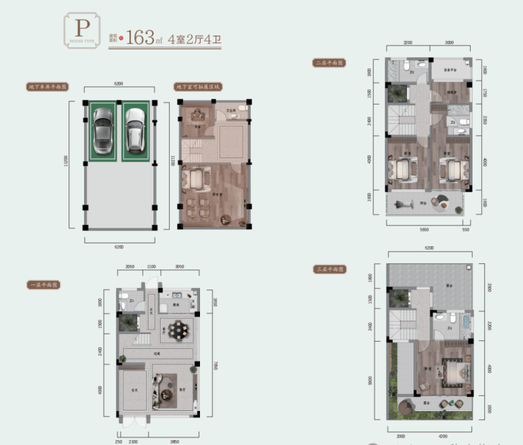 空间设计:垂直分层布局,功能分区明确——一层为挑空客厅与景观阳台组成的会客区;二层设双卧套房;三层为主卧套房,配备独立衣帽间与露台;地下约5.6米层高空间可改造为影音室、茶室或健身房,采光井设计保障通风采光。