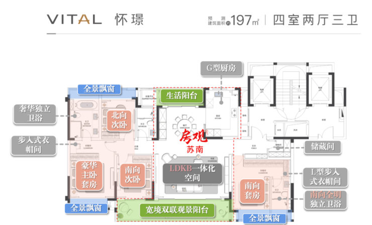 197㎡;197㎡四房两厅三卫534-607万大横厅+双联阳台,功能间灵活