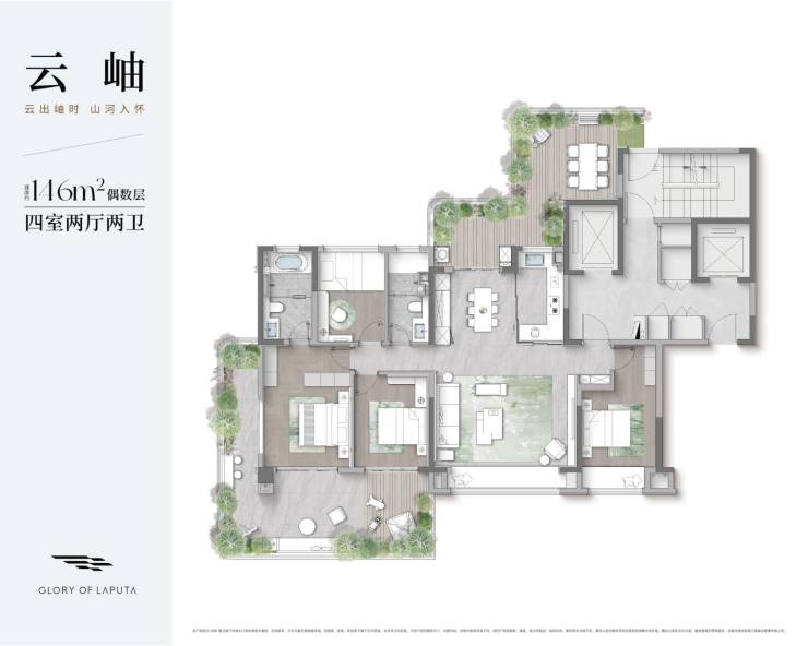 146㎡:四室两厅三卫,双露台设计,总价约360–380万元