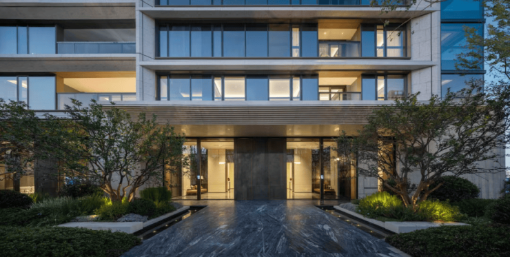 高层外立面由GOA大象设计陆皓操刀,采用横平竖直的立体框感设计,摒弃浮夸曲线,追求静谧美学;叠墅“瑞园”则借鉴蒙德里安画作风格,以石材与金属框格形成错落框景,建筑本身即成风景 。