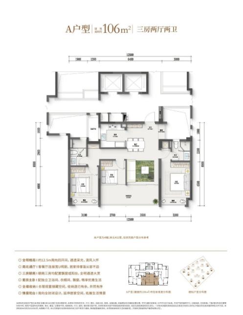 106㎡三房两卫:四开间朝南,南向采光面达12.5米,LDK一体化设计,得房率超85%,总价310万级起,是刚需家庭的首选。