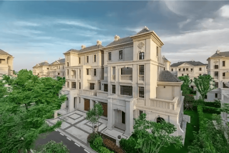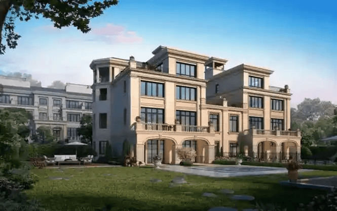 项目采用 法国古典主义建筑风格 ,承袭凡尔赛宫殿园林设计理念,立面以 石材干挂、对称布局、坡屋顶、雕花立柱 等元素还原法式贵族气质。