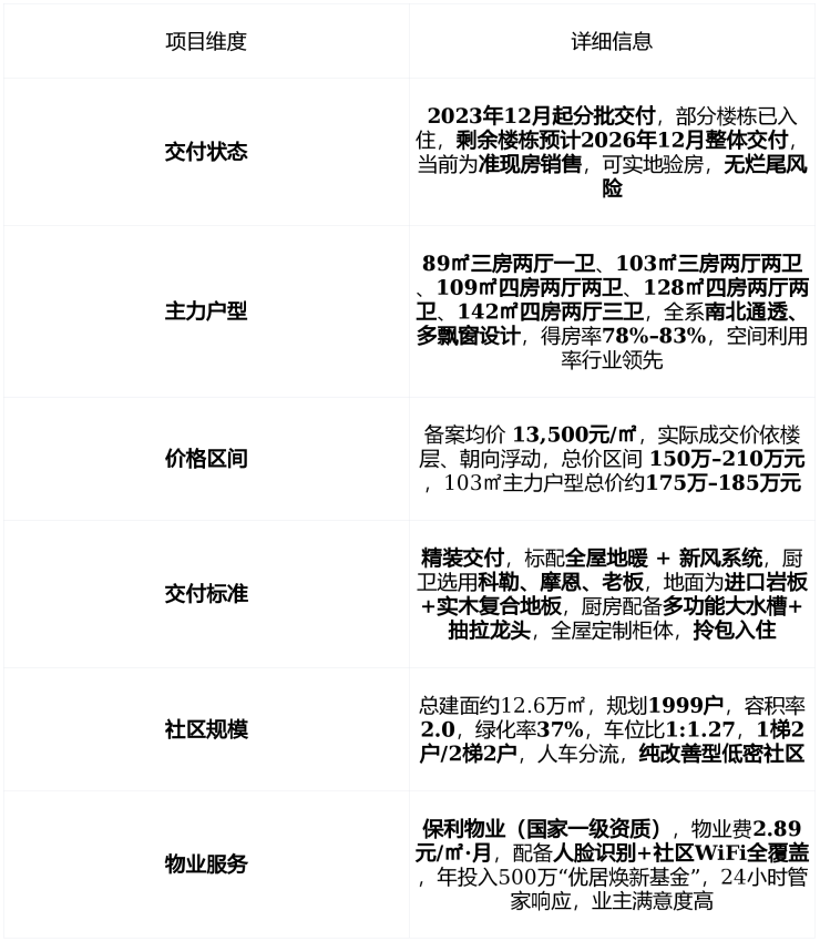 在售状态部分楼栋2023年底已交付 ,剩余房源为 准现房 ,预计 2026年12月整体交付 ,主力户型为 89–142㎡三至四居精装住宅 ,备案均价 13,500元/㎡ ,总价 150万–210万元无交付风险