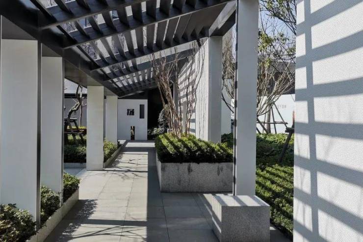 北地块社区大门设计使用传统的屋顶形式,配置可移动景墙面;建材采用轻盈通透的铝镁锰板,景墙采用美国白麻材质进行拉丝工艺,地面铺装采用棕麻黑材质。