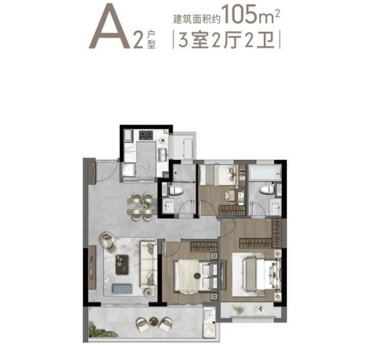 105㎡三室两厅两卫:经典竖厅设计,南向双卧+客厅三开间朝南,U型厨房连接生活阳台,总价约278万起。该户型动静分区明确,主卧套房设计,适合年轻三口之家