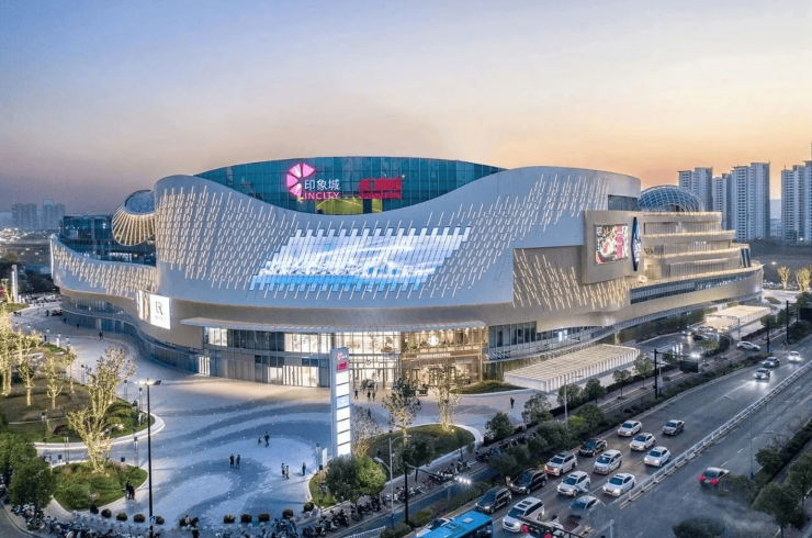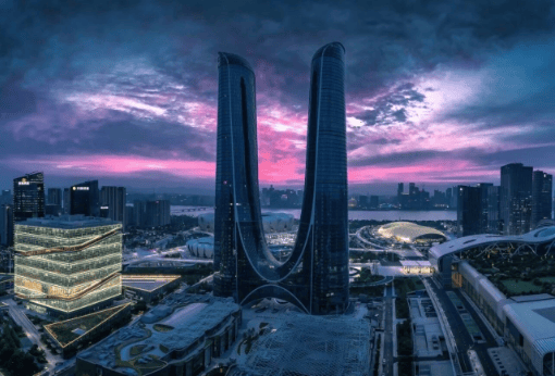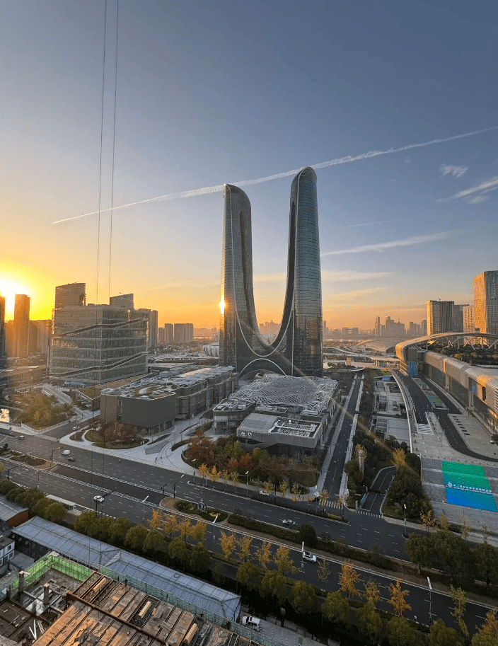 外立面 “丝绸流线”设计,灵感源自杭州织锦文化,玻璃幕墙如裙摆倾泻,夜间灯光极具辨识度