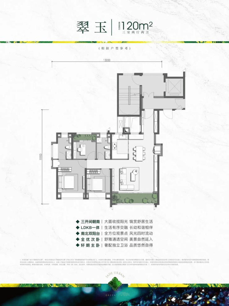 建面约110–119㎡:三至四室,四开间朝南,大方厅设计,采光通风优越