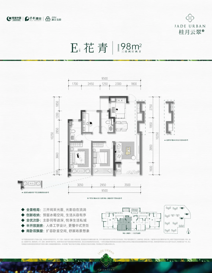 项目主力户型为建面约98–172㎡的三至四房,兼顾刚需上车与改善型家庭需求,得房率高达80%–82%,空间利用率领先同级。