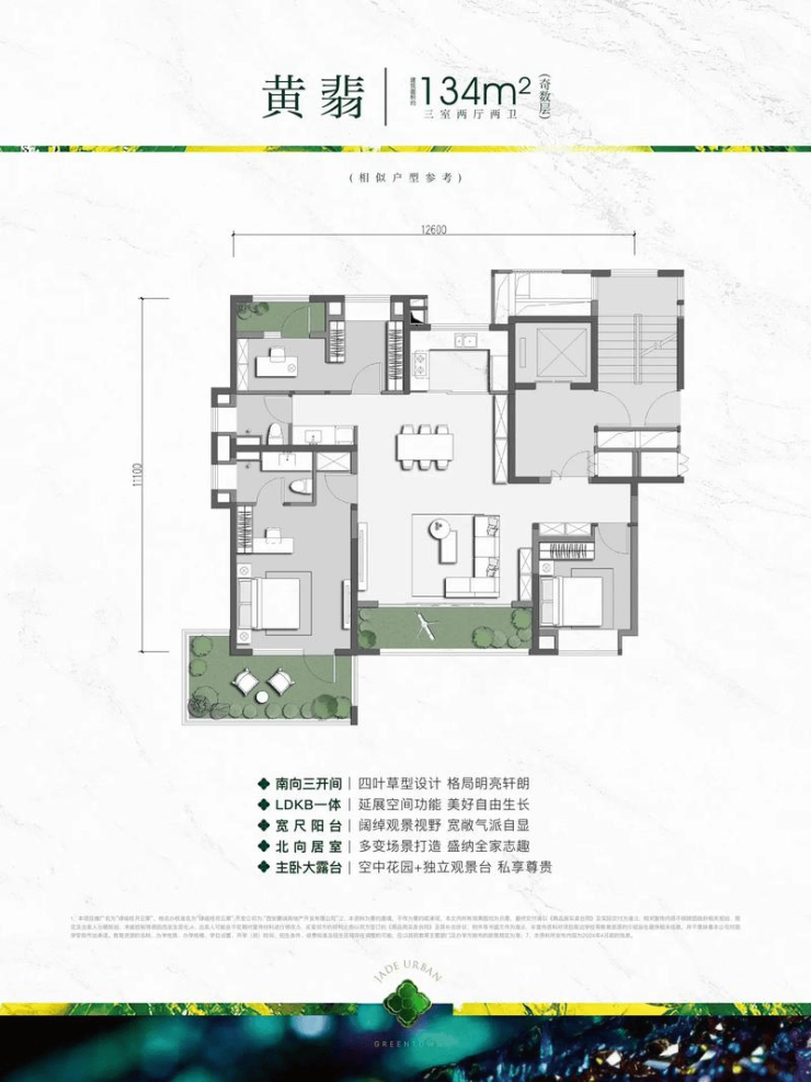 建面约139㎡:四室两厅两卫,市场热捧“四叶草”格局,动静分区明确,主卧套房带衣帽间,客厅连通6.35米大阳台,适合三代同堂