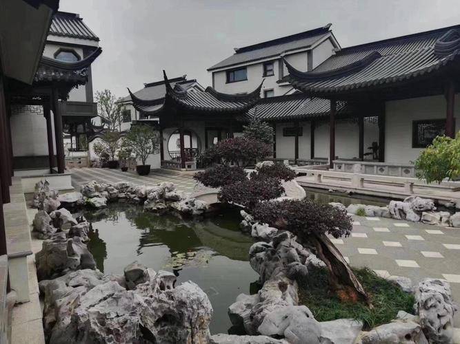 项目特邀"香山帮"非遗匠人团队操刀,采用花岗岩基座与黑釉筒瓦屋面,建筑外立面严格遵循苏式营造法式。园林内包含7座仿古石桥、3条太湖水系及百米果香长廊,实现"一院一景"的东方美学意境