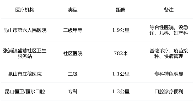 🏡 社区医疗资源密集,满足日常健康需求,三甲医院需前往昆山市区(约15公里)。