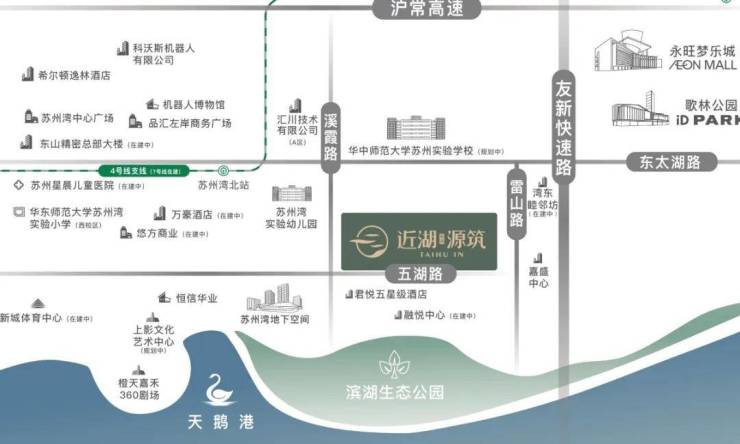 公建上:太湖生态公园、天鹅湖公园、360剧场、太湖新城科技文化馆(在建)、图书馆等;