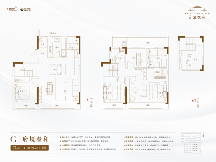 空间设计:私家电梯入户,4+2房布局,超宽客厅(约5.7米面宽)连接露台,主卧套房带观景飘窗,顶层露台可打造空中花园。