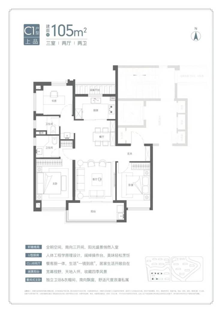 105㎡三房:提供宽厅(面宽5.5米)与竖厅双版本,搭配8㎡观景阳台,形成11.5米南向采光面,适合二胎家庭。