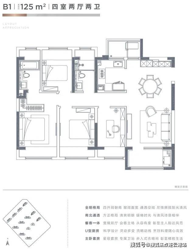 雅乐云庭建面约125㎡的四房两厅两卫户型,拥有四开间朝南的布局,南向面宽超过12米,确保了充足的阳光照射。餐客大横厅的设计,不仅使空间显得更加开阔,更方便家人之间的互动与交流。