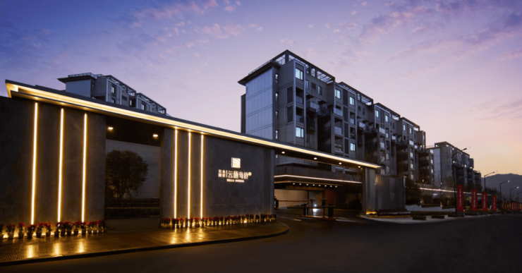 新中式灰墙黛瓦立面,融合全景玻璃幕墙,坡地台地式布局