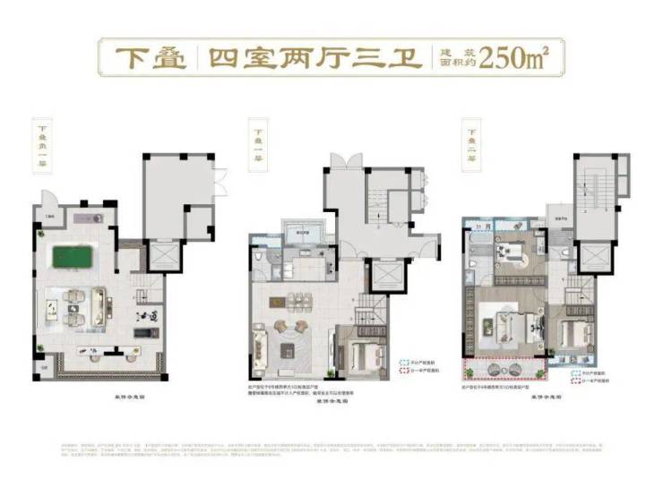 基于约1.3容积率的低密土地,打造禅境中式墅区产品,涵盖精装洋房(106-129㎡)和毛坯叠墅(上叠约145㎡、中叠约150㎡、下叠约250㎡),规划总户数422户