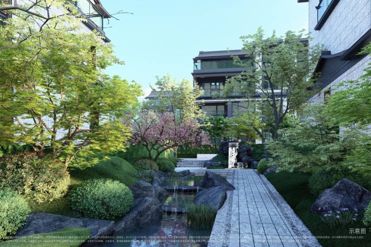 社区中央景观轴以"溪涧寻幽"为主题,贯穿南北,串联起中心花园、景观水系、茶趣广场等区域