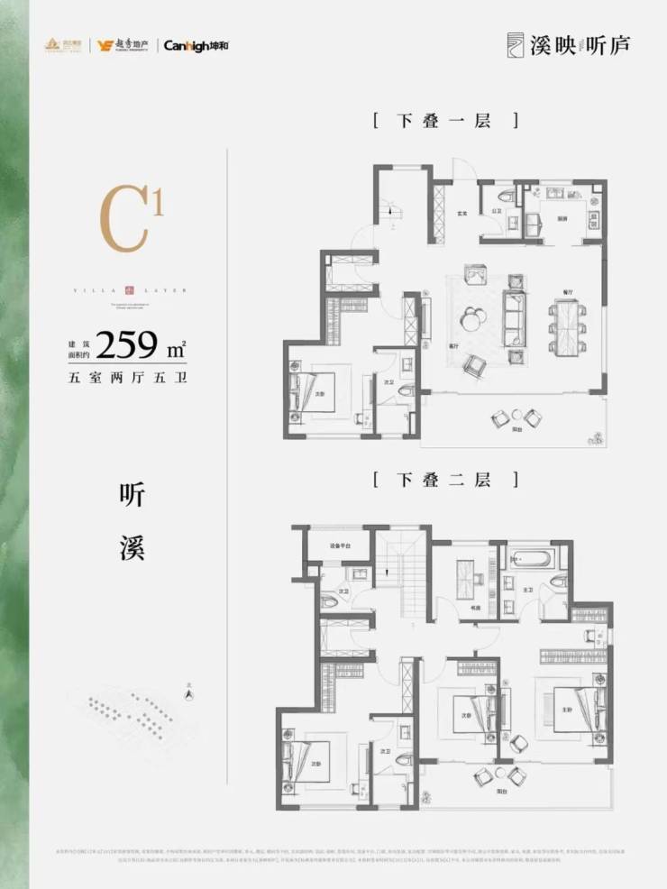 溪映听庐主力户型为建面约200-260平方米的叠墅,全部为五居室设计,包含以下主力户型