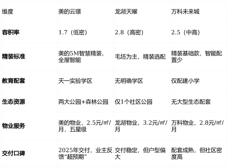 结论 :在同等价格带(2.1–2.5万/㎡)中,美的云璟是 唯一实现“低密+智慧精装+顶级学区+生态公园”四重叠加 的项目,性价比与居住品质兼具。
