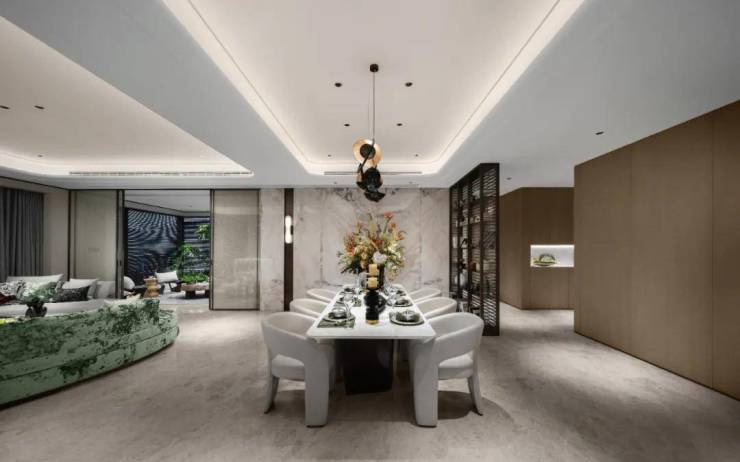 环幕三联厅这一精妙设计,成功打破了传统空间的界限,将客厅、餐厅以及多功能厅巧妙融合为一体。如此一来,家庭空间不再局限于单一功能,而是能够轻松承载丰富多彩、各式各样的家庭生活场景。