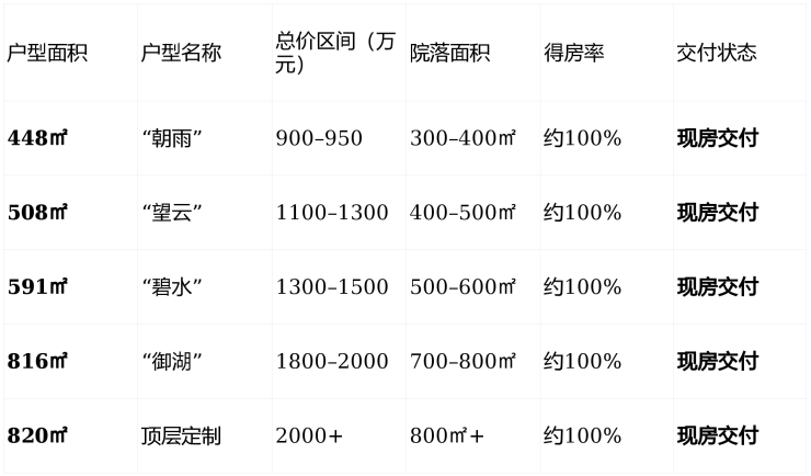 特别提示448㎡“朝雨”户型为入门款,近期有900万元起特惠,仅剩3席,湖景朝向优先锁定