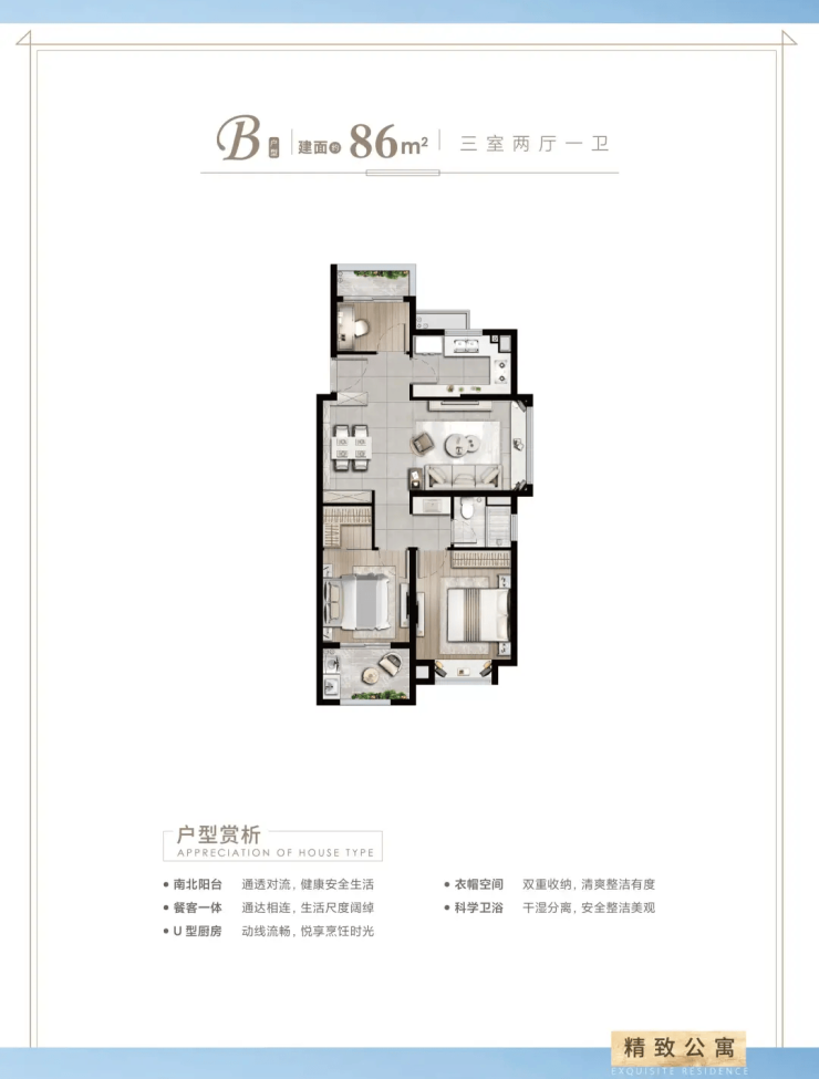 户型设计实用:高层主力户型如86㎡三房,实现双开间朝南、双阳台、270°飘窗,得房率75%-79%,空间利用率高。