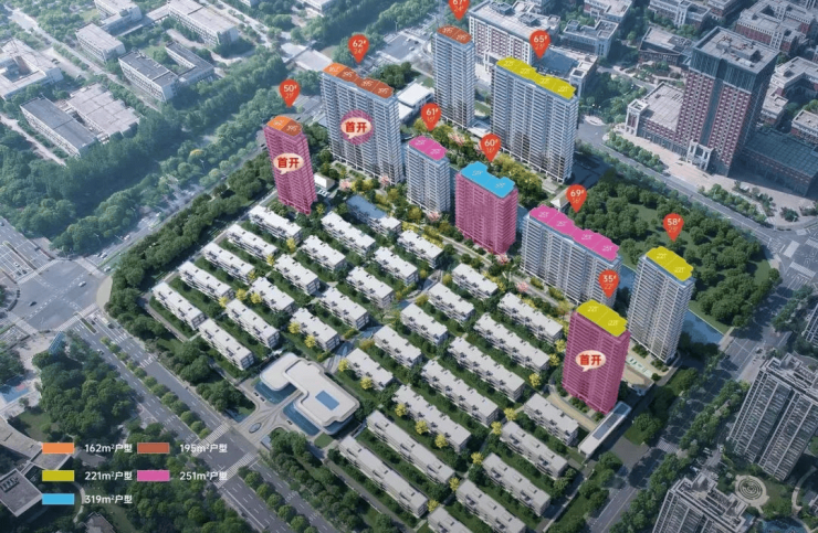 项目占地约8.48万㎡,容积率1.6,绿化率30%,规划602户(含联排别墅和大平层),车位配比1:2.48,物业费2.95-3.9元/㎡·月