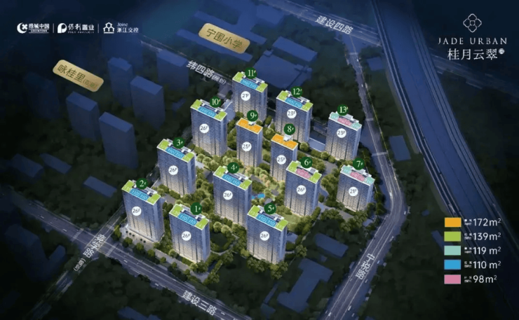 绿城桂月云翠园由绿城、保利、交控三大品牌联合开发(杭州宁佳置业有限公司),定位为萧山市北板块核芯的高层改善住宅集群,是绿城“天香家族”产品系在杭州的代表作之一。项目总占地5.8万㎡,总建面约19.75万㎡,规划13幢21–26层高层住宅,共1130户,容积率2.5,绿化率35%,物业由绿城服务提供,物业费3.7元/㎡/月(含能耗),预计2026年3月–4月交付。