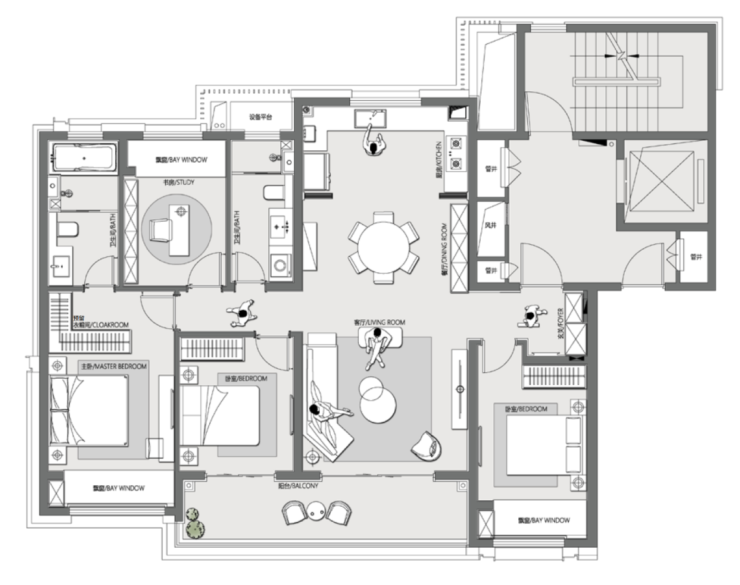 在互动空间的配置上,建面约143㎡户型打破了过去客餐厨分离的标配,创造出“餐-客-厨-阳台”4个空间独立又融合的高配设计。