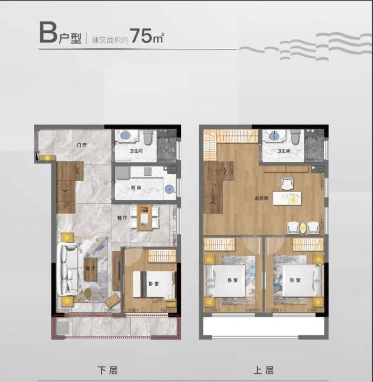 35㎡LOFT→ 下层客厅+厨房,上层卧室+书房,月租4500元+